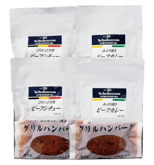 ・グリルハンバーグ180g×2・ビーフシチュー200g×2・あぶり焼きビーフカレー200g×2