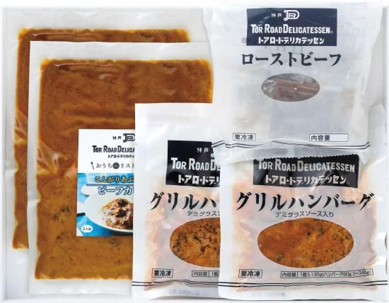・国産牛ローストビーフ(もも)130g・グリルハンバーグ(国産牛豚肉使用)135g×2・こんがりあぶり焼ビーフカレー200g×2